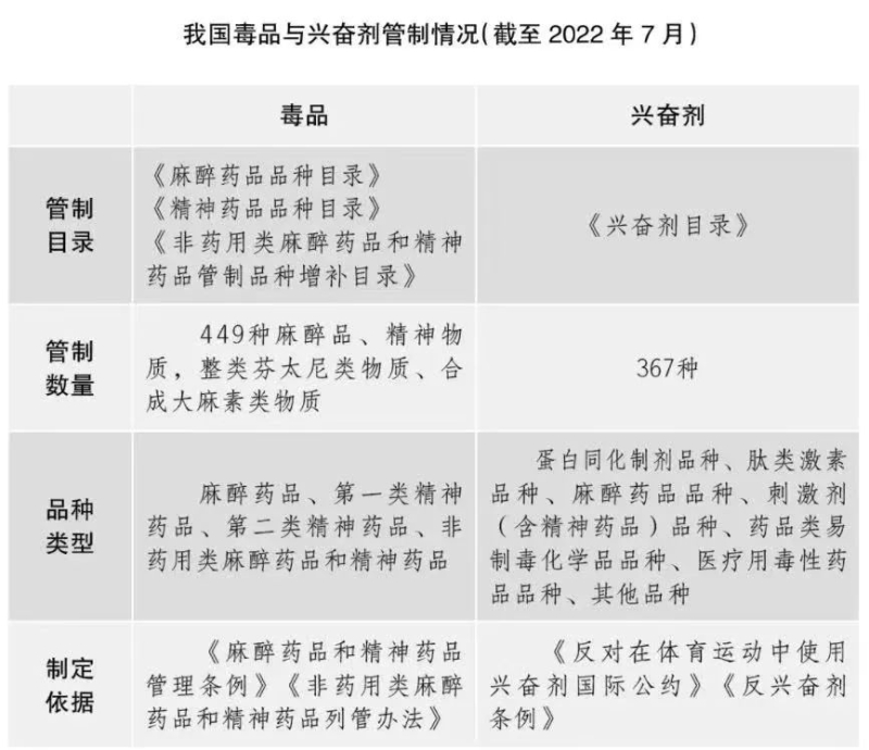 《反兴奋剂条例》规定,兴奋剂是指兴奋剂目录所列的禁用物质等。《反兴奋剂管理办法》规定,兴奋剂是指年度兴奋剂目录所列的禁用物质和禁用方法。兴奋剂目录每年发布一次,是参考《世界反兴奋剂条例国际标准禁用清单》,结合我国实际制定和发布的规范性文件。目前我国执行的是《2022年兴奋剂目录》,共含兴奋剂品种367种,其中,第三类为“麻醉药品品种”,第四类为“刺激剂(含精神药品)品种”,第五类为“药品类易制毒化学品品种”。