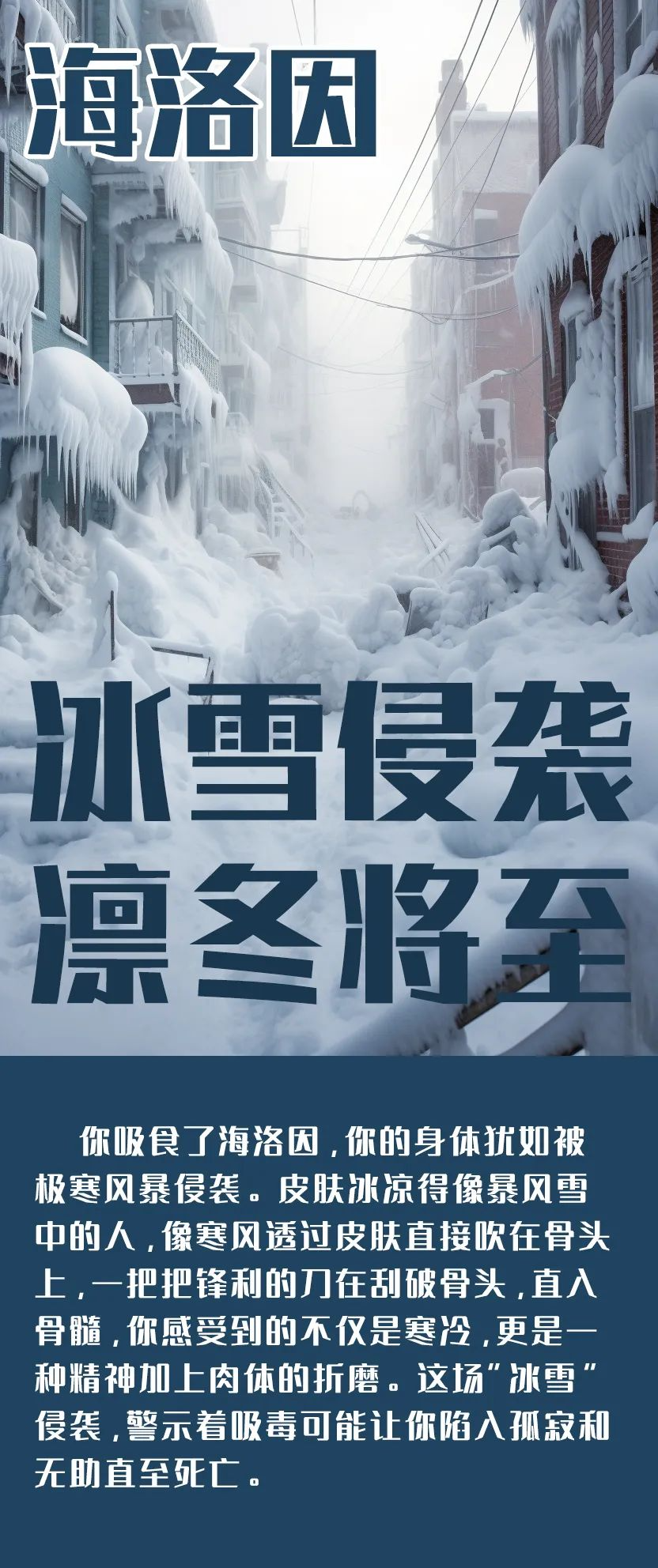 你吸食了海洛因,你的身体犹如被极寒风暴侵袭。皮肤冰凉得像暴风雪中的人,像寒风透过皮肤直接吹在骨头上,一把把锋利的刀在刮破骨头,直入骨髓,你感受到的不仅是寒冷,更是一种精神加上肉体的折磨。这场“冰雪”侵袭,警示着吸毒可能让你陷入孤寂和无助直至死亡。