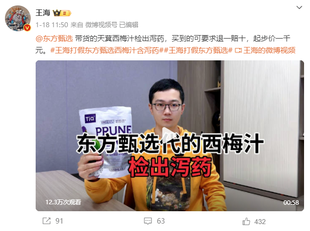 记者注意到,此次海关总署点出的天萁西梅汁,正是此前打假人王海投诉东方甄选被检出泻药成分的带货产品。
