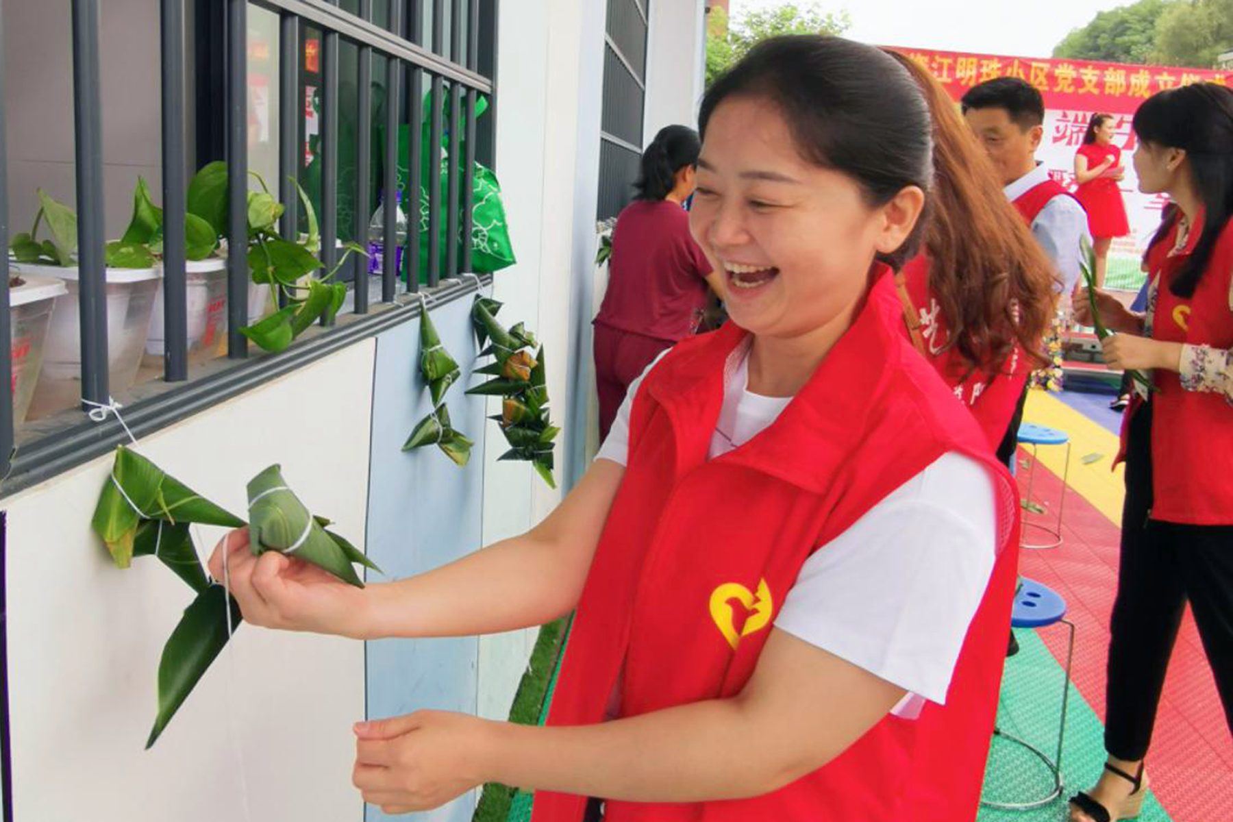 活动现场,社区搭建了端午活动台,精心设计了端午主题宣传背景墙,整齐摆放着包粽子桌子、凳子;并为大家备齐了糯米、粽叶、筷子及绑粽绳。市医保局干职工与社区居民围在一起,一边观看社区居民、小朋友们歌曲舞蹈等文艺演出,一边亲切交谈、宣传医保政策、推广电子医保卡,一边学包粽子。大家拿出看家本领,捋粽叶、卷粽型、填糯米、压紧实、封扎捆,一只只粽子便呈现在大家的面前,大家的脸上洋溢着节日的快乐。