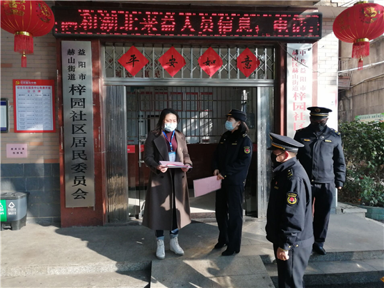 大队领导带队上门与社区对接,发放防疫温馨提示