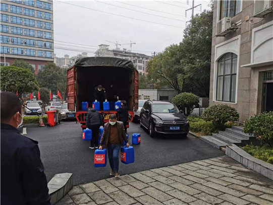 2月11日下午,在市交警支队警车一路护送下,湖南宝基地产集团满载疫情防控物资的卡车,驶入市城管执法局机关大院。
