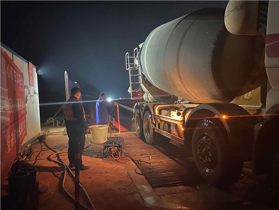4月8日,赫山区渣土管理大队队员督促客天下工地混凝土搅拌车净车出场