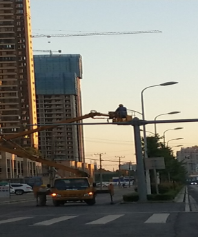 凌晨4点,路灯中心工作人员检修路灯剪影