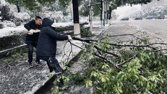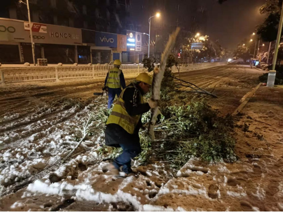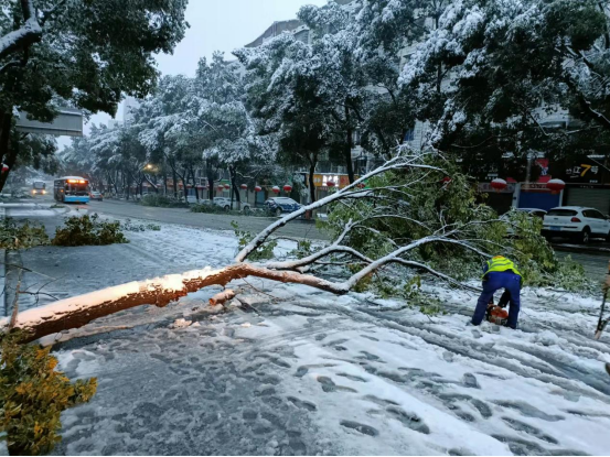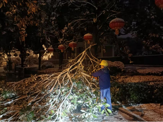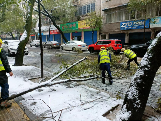 在城区不少路段和公园,道路两旁的行道树被厚厚的积雪覆盖,树枝不堪重负,有的被大雪压断,直接倒在人行道上;有的垂在空中,随时有掉落下来的危险。市园林公司立即启动雨雪冰冻天气应急响应,出动应急抢险人员共计240余人,分别前往五一路、龙洲路、秀峰路、桃花仑路、康复路、金山路、益阳大道等主次干道和各公园广场进行应急抢险。