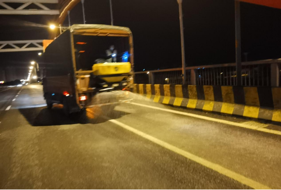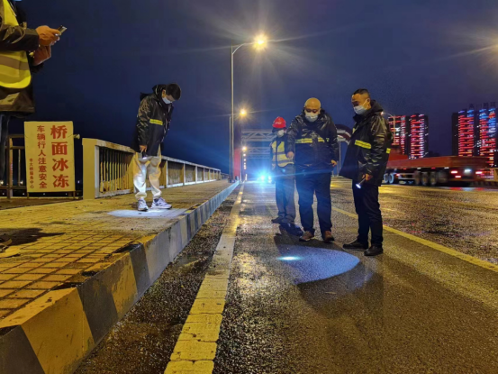12月1日凌晨2时,对会龙山、龙洲大桥桥面轻微结冰部位撒盐除冰