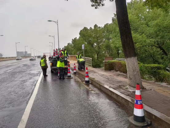 对会龙山、龙洲大桥桥面两侧摆放锥桶,警示过往车辆