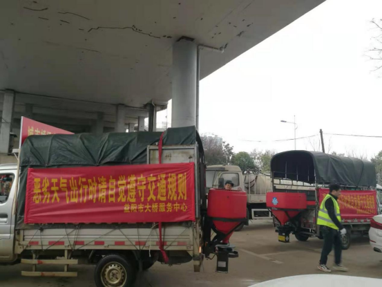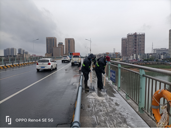 11月30日至12月1日凌晨,全市境内出现明显降雪降温,中心迅速出动巡查人员20人,工程车1台,撒盐车3台,装载工业盐8吨,开展应急处突。12月1日凌晨2时和7时,组织人员设备对城区会龙山、龙洲大桥轻微结冰部位进行撒盐融雪作业,在两座桥梁主车道两侧设置安全警示锥桶400个,警示提示牌30块,洒工业盐2.5吨,并对桥南人行天桥铺设防滑麻袋500米,设置警示牌8块,组织人员10人对城市桥梁人行道积雪进行清理,力保行人、车辆出行通畅。