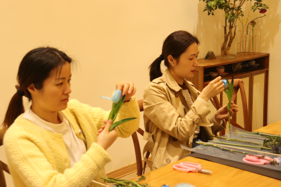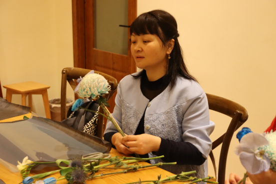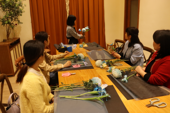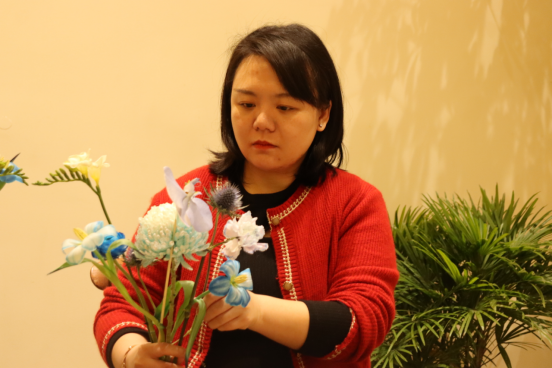 活动中,4名女干职工们在花艺师的指导下修剪枝叶、搭配色彩、设计造型,体验亲手创造花艺作品的快乐,用心感受花艺魅力和生活之美。在阵阵花香和浪漫氛围中,一盆盆错落有致、别出心裁的插花作品展现在大家眼前,令人赏心悦目。