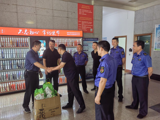 8月2日上午,市城管执法局党组成员、副局长李友松先后前往直属二大队、直属五大队、直属六大队以及指挥中心,看望慰问在高温下坚守岗位、辛勤劳动的一线执法队员,为他们送去纯净水、西瓜、绿豆、花露水、毛巾等防暑降温物品。李友松与一线城管队员亲切交谈,详细了解市容秩序管理、工作运转、值班值守等情况,向大家的辛勤付出表示感谢,并叮嘱大家做好个人安全防护,劳逸结合,注意防暑降温。