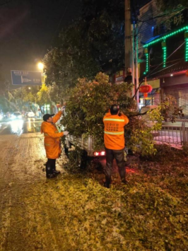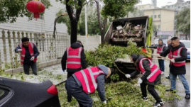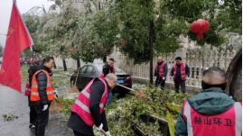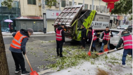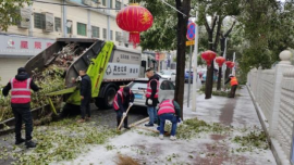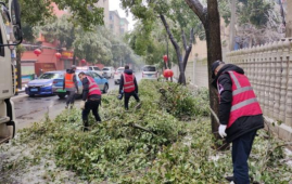 全力配合园林绿化和市政公司加快清理倒树残枝,并紧急调度铲车和大型收集车、清运车,动用斧头、电锯等工具,先分割整理,再将树枝分批转运,对机械无法到达的区域进行人工清运。