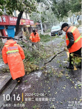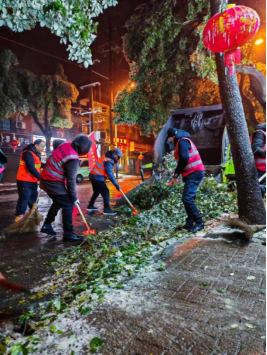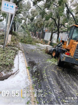 2024年2月5日晚上十点开始,益阳雨雪寒潮再次升级,桃花仑沿线、青年路、人民路、金山路、滨江路、会龙路等绿化树木大面积破坏,倒树断枝随处可见,造成道路封堵,给城市的交通和市民的生活带来了极大的安全隐患和通行不便。为了保障市民的出行安全和城市的正常运转,赫山环卫闻令而动,主动作为,组织党员突击队,工作重点由洒盐防冻改为清障保畅,值班人员迅速集结,凌晨2点开启“白加黑,机械加人力,全员上线”的模式,通宵达旦打响了一场清障保畅保卫战。
