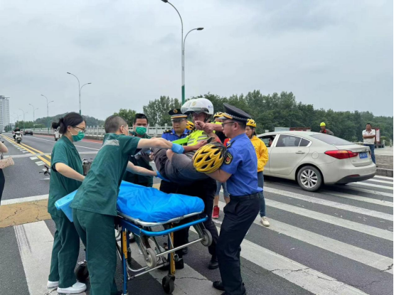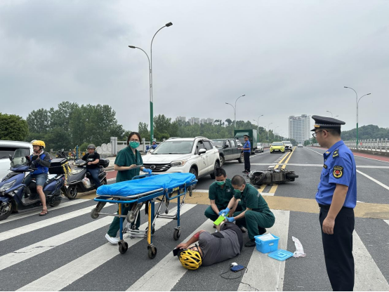 只见两台电动摩托车相撞,一男一女驾乘人员受伤倒地。执法队员华俊、胡志伟、谢俊、陈宁蓉等人迅速停车,对伤者的伤情进行了初步观察,其中一名伤者情况较为严重,华俊立即拨打了120急救电话和122交警事故处理电话,请求专业救援和事故处理。