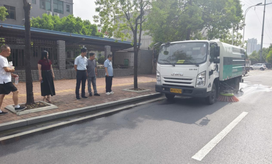 钟涤非查看了路面积尘检测系统内扬尘数据偏高的贺家桥路、五福路、白马山路,分析了重点路段扬尘数据偏高的原因,现场检验机动清扫车清扫效果,要求资阳区改变工作方法,减少洒水次数,增加机扫频次。