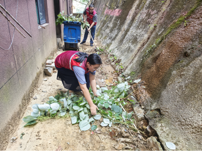 从大海塘社区工作人员处得知,社区所辖有几处居民小区周边因地处偏僻以及责任归属等问题成为环境卫生“盲区”,长久以来是社区工作人员和社区居民的“心头大患”。身穿红马甲的市环卫中心党员们迅速行动,在社区工作人员的带领下深入社区各卫生死角,用扫把和垃圾夹等工具,将绿化带和背街小巷的烟蒂、白色垃圾、枯枝等陈年垃圾进行了彻底清理。当来到嘉信大厦东侧时,党员们发现了一条因常年未打理而杂草丛生的小巷,他们立即借来了铁锹铲除淤泥,预备党员侯瑞云更是徒手拔除野草树枝。经过党员们一上午不怕脏、不怕累的齐心协作,社区的各卫生“盲区”的环境恢复了干净整洁,不仅方便了居民出行,而且避免了蚊虫滋生。