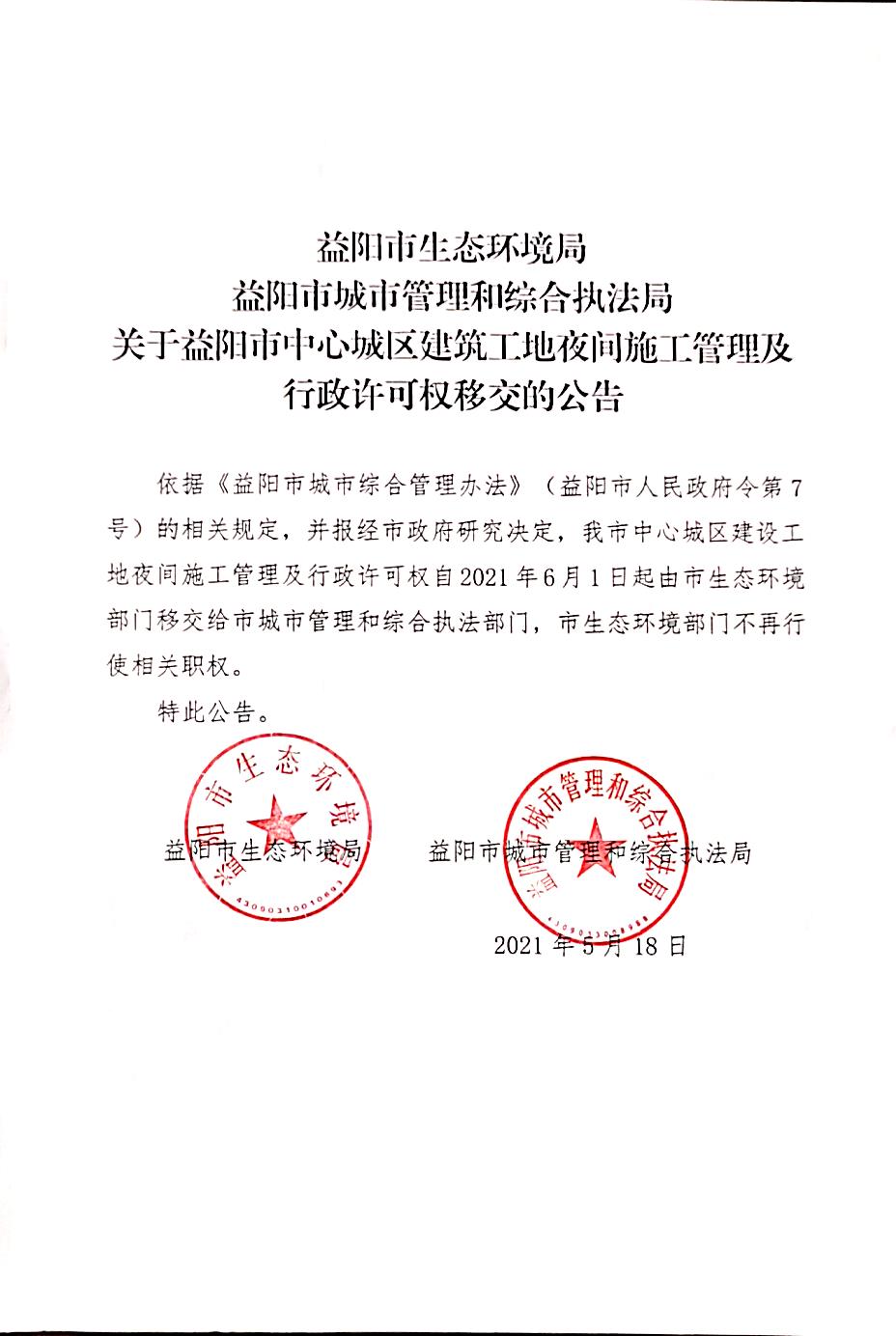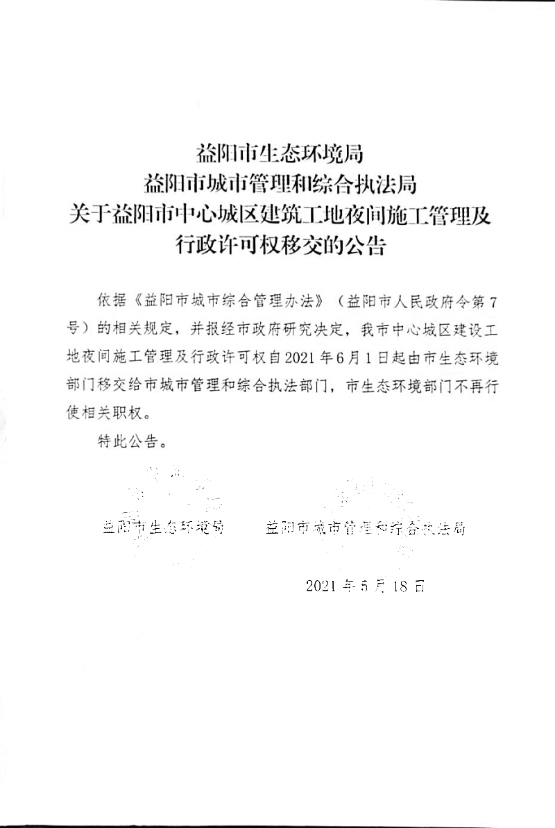 关于益阳市中心城区建筑工地夜间施工管理及行政许可权移交的公告