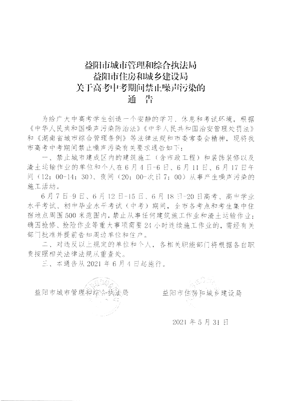 关于高考中考期间禁止噪声污染的通告