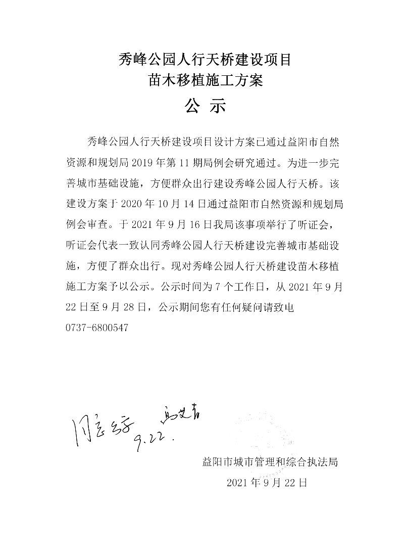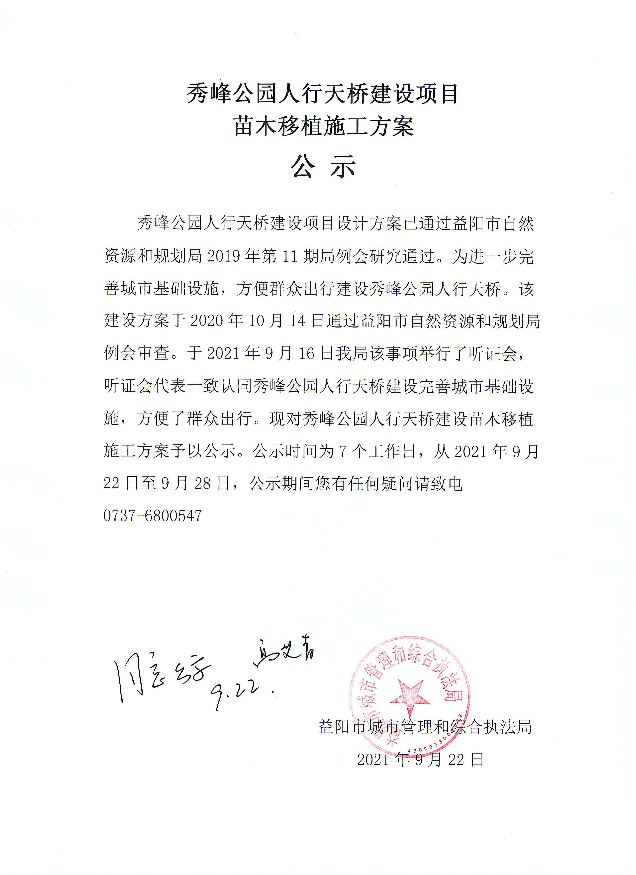 秀峰公园人行天桥建设项目苗木移植施工方案公示