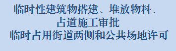 一、行政许可事项名称 临时性建筑物搭建、堆放物料、占道施工审批 临时占用街道两侧和公共场所许可 二、实施机构 益阳市城市管理和综合执法局 三、许可依据 《城市道路管理条例》(国务院令第198号);《城市市容和环境卫生管理条例》(国务院第101号令)第十四条 四、许可条件 1.申请人为具有独立资格的法人和社会其他组织; 2.建设单位因新建、扩建、改建项目需要临时占用城市道路的; 3.因门面装修等需要临时占用城市道路的; 4.因建设需要,搭建非永久性建(构)筑物或其他设施的; 5.需在道路上开设单位进出口或消
