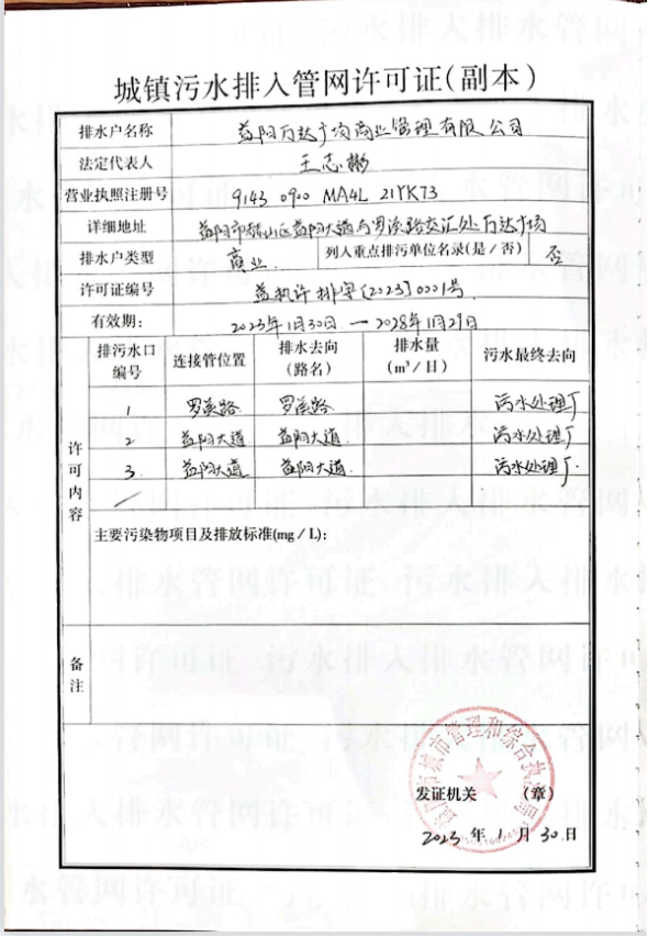 城镇污水排入管网许可证(万达)