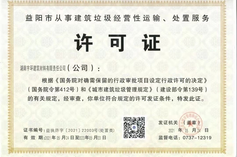 湖南宇环建筑材料有限责任公司从事建筑垃圾经营性运输、处置服务许可证