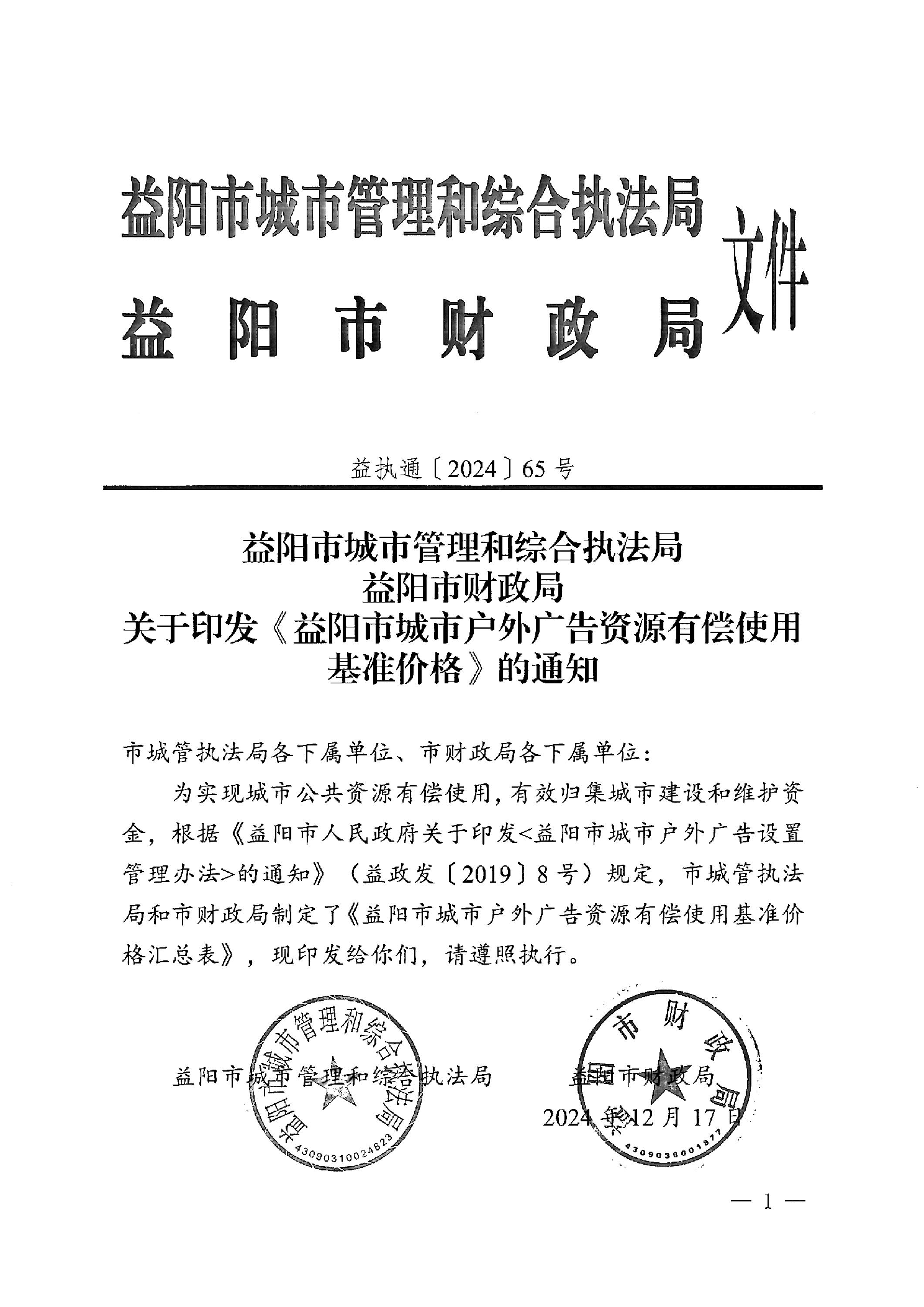 益阳市城市管理和综合执法局 益阳市财政局 关于印发《益阳市城市户外广告资源有偿使用基准价格》的通知