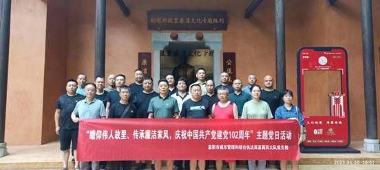 2023年6月30日,益阳市城管执法局直属四大队党支部开展“瞻仰伟人故里、传承廉洁家风,庆祝中国共产党建党102周年”主题党日活动,组织全体党员干部赴胡耀邦故居和秋收起义文家市会师纪念馆参观学习,感受胡耀邦同志“一生正气、两袖清风”的廉正作风,以及革命先烈们为了人民幸福勇于投身革命、不畏牺牲的可贵精神。