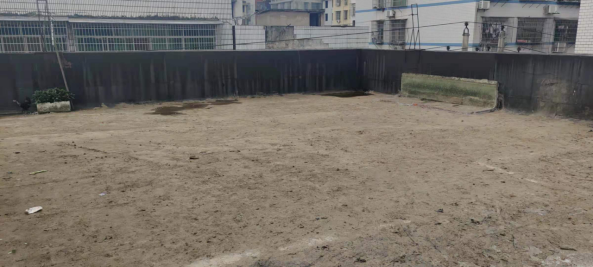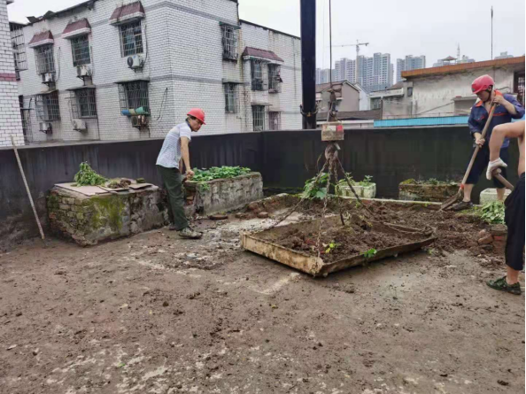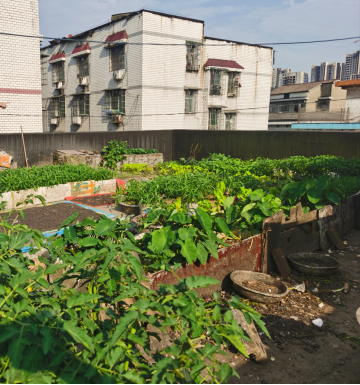 用砖头、木板围砌或者泡沫箱装土顶楼种菜现场