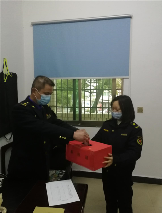 会后,该大队全体党员积极响应局机关党委倡议,捐款1300元助力疫情防控。大队党支部还来到龙洲公园,向4家物业公司赠送防疫物资,发放疫情防护知识手册,督促各公司加强疫情防控不松懈,科学组织公共场所和公共设施消杀,及时劝离资江风貌带聚集人员。