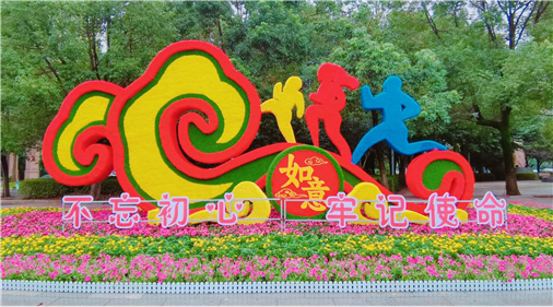 在龙洲广场西南角,“不忘初心、牢记使命”主题花展,艺术展示了全党高举中国特色社会主义伟大旗帜,为实现中华民族伟大复兴的中国梦而进行的不懈奋斗。