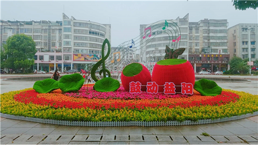 鼓动益阳花卉造型,位于鹅羊池公园。在益阳人的回忆中,鹅羊池荷花满塘盛开,潋滟清波、绿叶红朵,四季的风情是益阳人精神的寄托。此处绿雕荷花与益阳花鼓相结合,鼓动一曲动人的乐章。