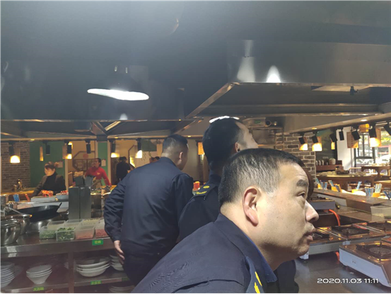 城管执法队员查看餐饮门店安装油烟净化设施情况