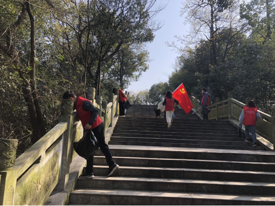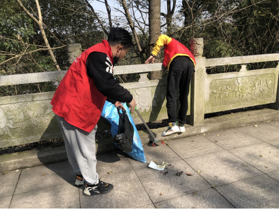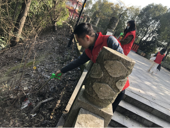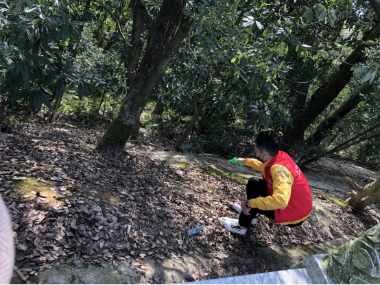 当日早上8时,志愿者们到达会龙山公园,身穿红马甲,手拿垃圾袋,在树丛中认真捡寻丢弃的烟头、碎纸屑、枯树叶、塑料瓶等垃圾,工具用不上,便直接徒手清理。有些垃圾散发出恶臭,但大家不顾脏不怕累,齐心协力,不到一个多小时,现场就打扫得干干净净,获得公园游人齐声点赞。