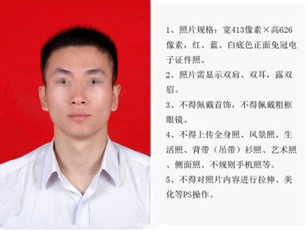 4.电子证件照片。报名人员应当提供符合规定格式(照片文件类型为JPG格式,照片标准尺寸为:宽413像素×高626像素,照片文件大小为:40KB≤文件大小≤100KB)要求的本人近三个月内彩色(红、蓝、白底色均可)正面免冠电子证件照片。照片应当清晰完整,需显示双肩、双耳,露双眉;不得佩戴首饰,不得佩戴粗框眼镜(遮挡面部特征会影响考试期间身份检验);不得上传全身照、风景照、生活照、背带(吊带)衫照、艺术照、侧面照、不规则手机照等。不得对照片内容进行拉伸、美化等PS操作,照片比例与本人真实情况不符、照片美化操作会影响考试期间身份检验,建议前往正规照相馆按照要求拍摄制作,若已有符合要求的照片,可参照报名系统中《电子照片制作指南》修改照片尺寸及大小。此照片将作为本人准考证、考试成绩通知单、法律职业资格授予申请表、法律职业资格证书唯一使用照片,请务必妥善保存。凡在报名截止时间前,上传照片不符合规定要求,并未及时进行更改的,报名将不成功,由此造成的一切后果由报名人员自行承担。