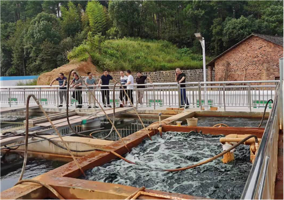调研组一行首先实地参观了安化县清塘铺镇洞天河流域落水洞煤矿关停矿洞矿涌水处理站,该处理站主要工艺构筑物包括调节池、前处理池、曝气池、沉淀池、一级深床离子反应池、二级深床离子反应池、污泥暂存池等辅助及配套设施。同时技术单位爱土工程环境科技有限公司向调研组介绍了公司自主研发的矿山废水深床离子反应生态修复技术和成功案例。