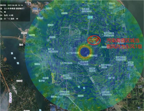 (6月8日16时雷达扫描在雷达监测点位东北侧梅元东苑附近存在污染高值点位,气象显示当前为东风偏北,可能此区域存在本地污染。)
