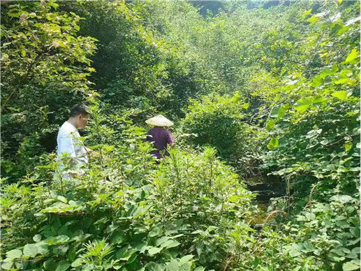 上图为工作人员披荆斩棘对桃江县松木塘镇樟溪村梅岭溪饮用水水源保护区进行核查