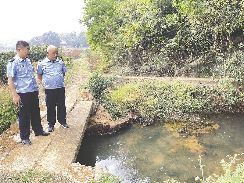 益阳市生态环境局、益阳高新区生态环境分局相关执法人员现场勘察赫山区泉交河镇胡林翼村农田沟渠水质。