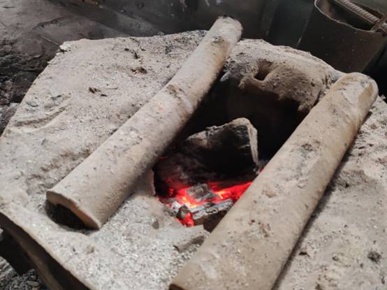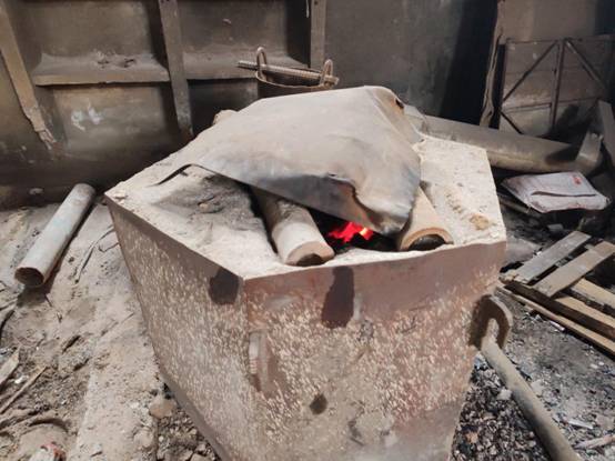 上图为:益阳市资阳区某机械制造厂用于浇注桶加热的移动式火炉正在燃烧。
