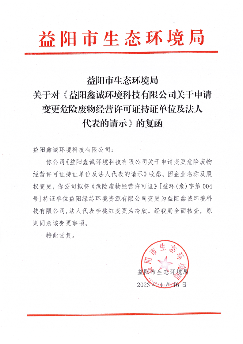 益阳市生态环境局关于对《益阳鑫诚环境科技有限公司关于申请变更危险废物经营许可证持证单位和法人的请示》的复函