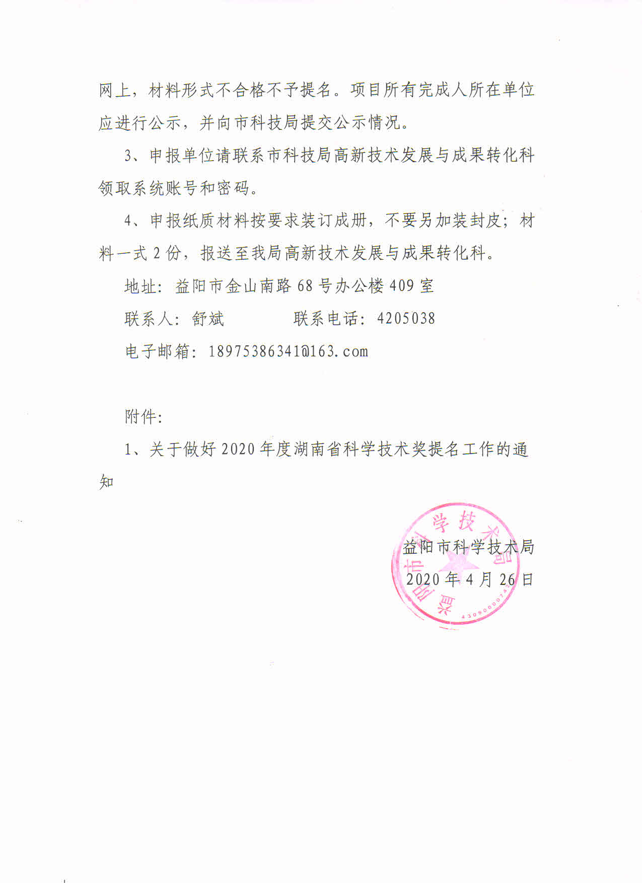 益阳市科学技术局关于开展2020年度湖南省科学技术奖提名工作的通知