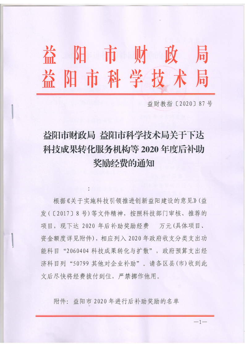 关于下达科技成果转化服务机构等2020年度后补助奖励经费的通知