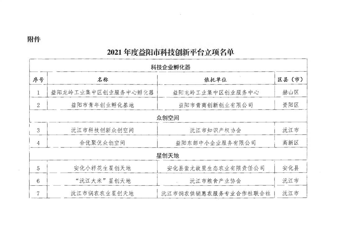 益科字〔2021〕58号 各区县(市)科技(工)局、高新区产科局、各有关单位: 根据《关于印发〈益阳市重点实验室建设与运行管理办法(试行)〉等市级科技创新平台管理办法的通知》(益科字〔2020〕59号)和《关于印发〈益阳市新型研发机构管理办法〉的通知》(益科字〔2021〕23号)文件精神,经推荐申报、形式审查、专家评审、现场考察、会议审定等程序,决定组建立项益阳龙岭工业集中区创业服务中心孵化器等16个科技创新平台。 各依托单位要根据相关管理办法切实推进平台建设,加强平台运行管理,建立健全科研项目、知识产权、人才培养、财务和设备使用等方面的管理制度,营造鼓励创新服务产业的良好氛围,提升管理服务水平与创业孵化能力,为“三高四新”战略的实施和全市经济高质量发展培育新动能,增添新活力。各主管科室应加强业务指导,支持平台创新体制机制,为平台发展创造良好的环境和条件,各平台在组建期满后由各主管科室组织验收工作。 附件:2021年度益阳市科技创新平台立项名单 益阳市科学技术局 2021年12月2日