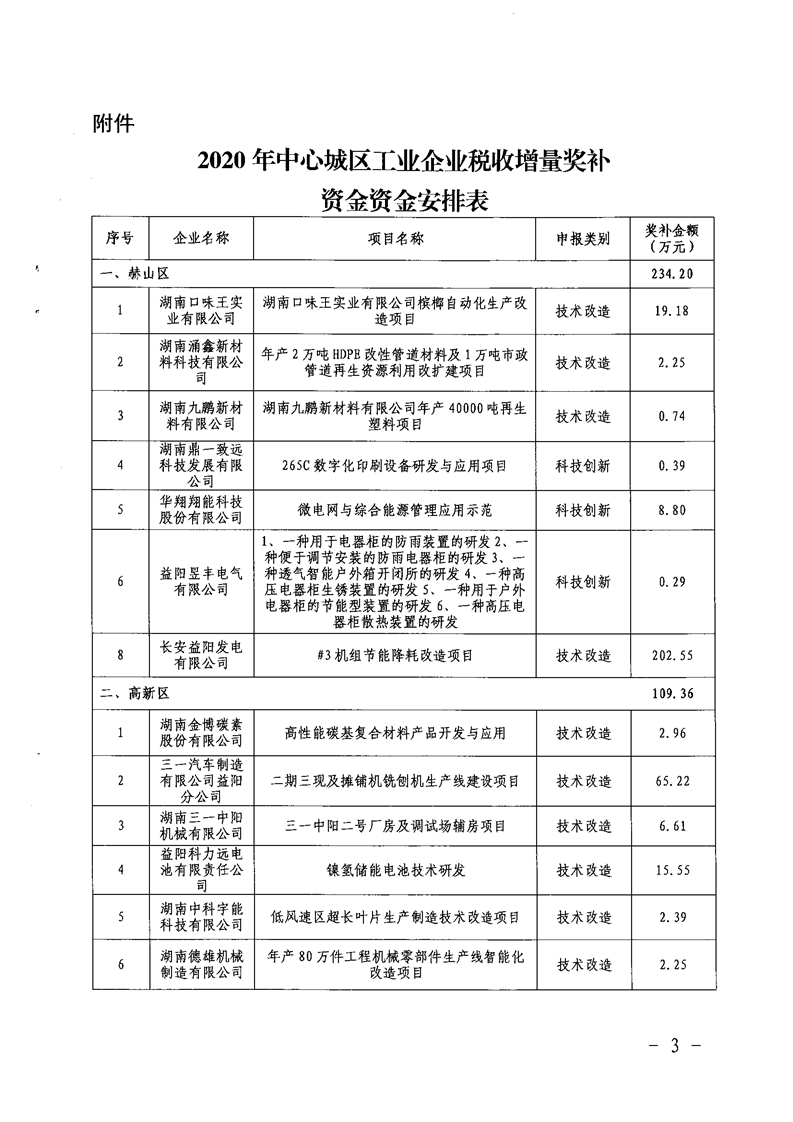 益财企〔2021〕367号 益阳市财政局 益阳市工业和信息化局 益阳市科学技术局 关于下达2020年中心城区工业企业税收增量奖补资金的通知 : 推动我市“三高四新”战略落地见效,切实发挥市级财政资金对工业企业的支持和引导作用,加快培育优质财源税源,根据《益阳市中心城区工业企业技术改造 科技创新税收增量奖补实施办法(试行)》(益财企〔2021〕260号)有关规定,经研究,并报市人民政府审定,现下达你区2020年中心城区工业企业税收增量奖补资金 万元(具体明细见附件)。请列入2021年政府收支分类支出功能科目“2069999其他科学技术支出”,支出经济分类科目“31299其他对企业补助”,政府预算支出经济分类科目“50799其他对企业补助”。 请你区接此通知后,迅速将资金下达到相关企业,发挥财政资金效益。 附件:2020年中心城区工业企业税收增量奖补资金安排表 益阳财政局 益阳市工业和信息化局 益阳市科学技术局 2021年12月17日