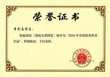 李剑志今年喜讯不断,5月,他获得湖南省“最美科技志愿者”荣誉称号;1月,他编著的《湖南鸟类图鉴》,经过专家的反复评审,荣获中华人民共和国科学技术部颁发的“2019年全国优秀科普作品”奖。