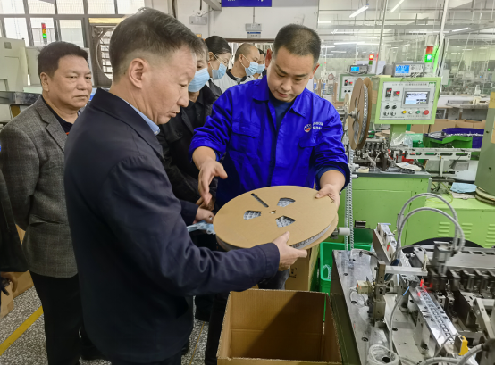 高德文一行在安兴电子生产车间察看