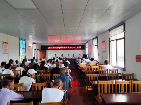 7月1日上午,赫山区科技局党支部书记李建眀赴帮扶村兰溪镇羊角村携村两委组织全体干部、党员集中收看了庆祝中国共产党成立100周年大会并上党课,与基层党员一同喜迎建党100周年。