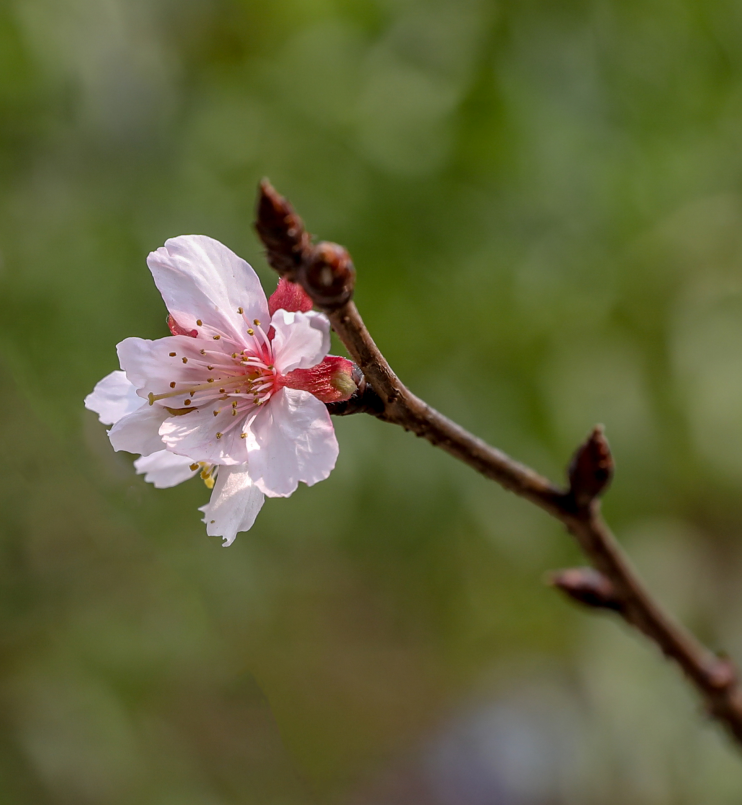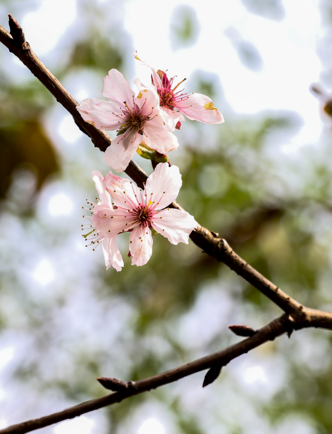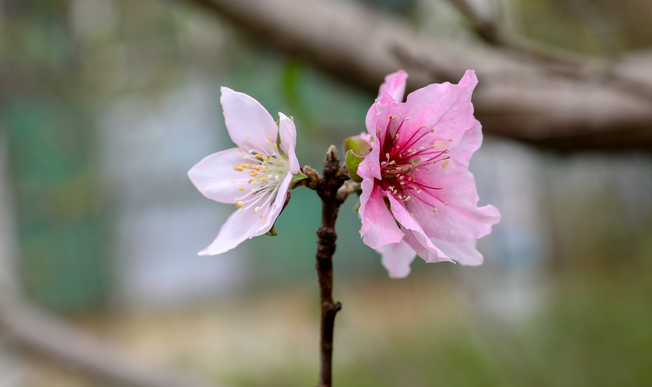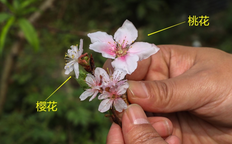 桃花、樱花由于颜色、花开季节相近,经常有市民将两种花混淆,傻傻分不清楚。丁胜华为此向周边群众从两种花花朵形状上,科普区分两种花的有效方法:樱花的花瓣尖上有细小的缺口,花梗较长,花朵呈簇状分布,花型较小;而桃花的花瓣呈椭圆形,花瓣尖上没有缺口,花梗较短,花朵数量较少,花型也比樱花大。