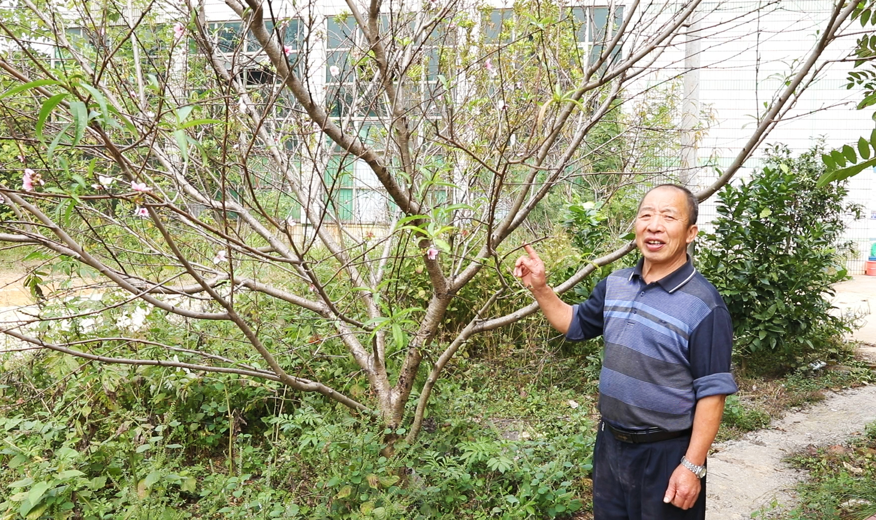 在村民潘建华家门口,一棵树龄3年,树高约2.5米的桃树上,数朵桃花在枝头开得正旺,红的,粉的,白的,甚是艳丽。潘建华介绍,2019初,他从市场上购回杏、梨、桃几棵果树,种在了自家房子边上。这两年,桃树都是3月初开花,5、6月挂果。今年国庆期间,潘建华无意间发现桃树枝上出现几个小花蕾,国庆假期还没结束,几朵桃花悄然盛开。“花开鼎盛时期是在十月中旬,桃花差不多开满了枝头,附近好多村民都来围观,但都不知道是什么原因”,潘建华表示,自己快七十岁了,从未见过十月桃花盛开的现象。
