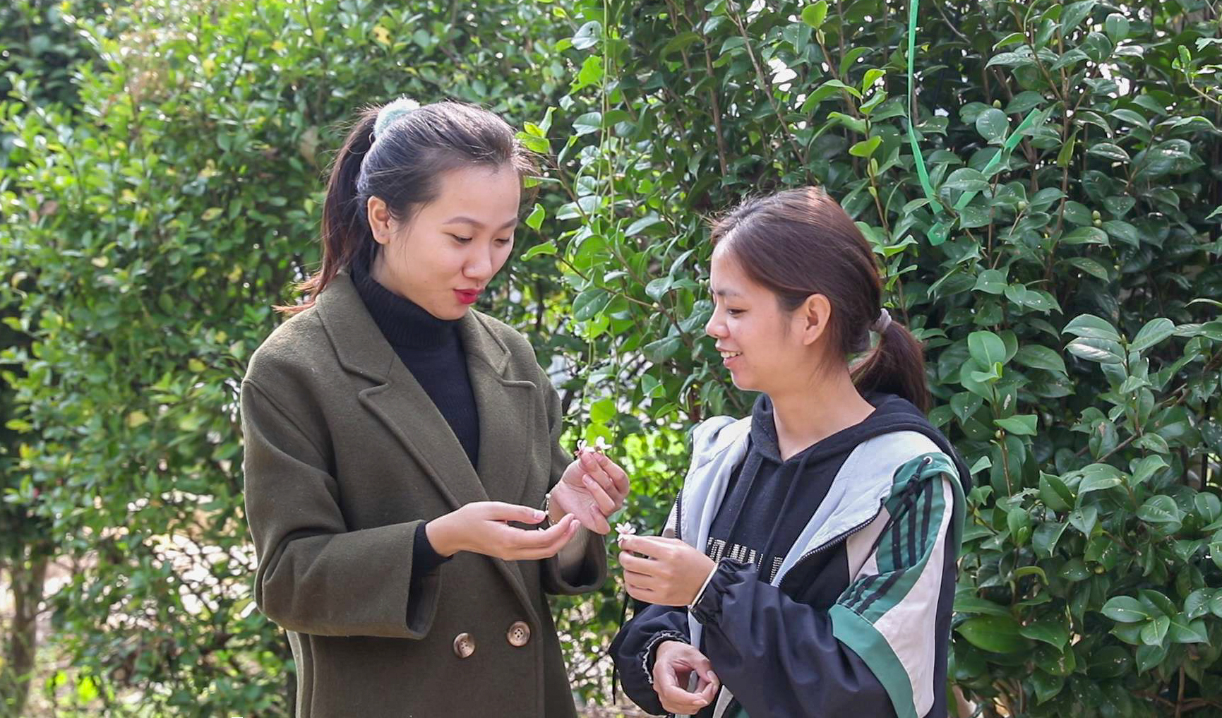 村民瞿甜甜(右)家一簇簇樱花矗立枝头 争奇斗艳